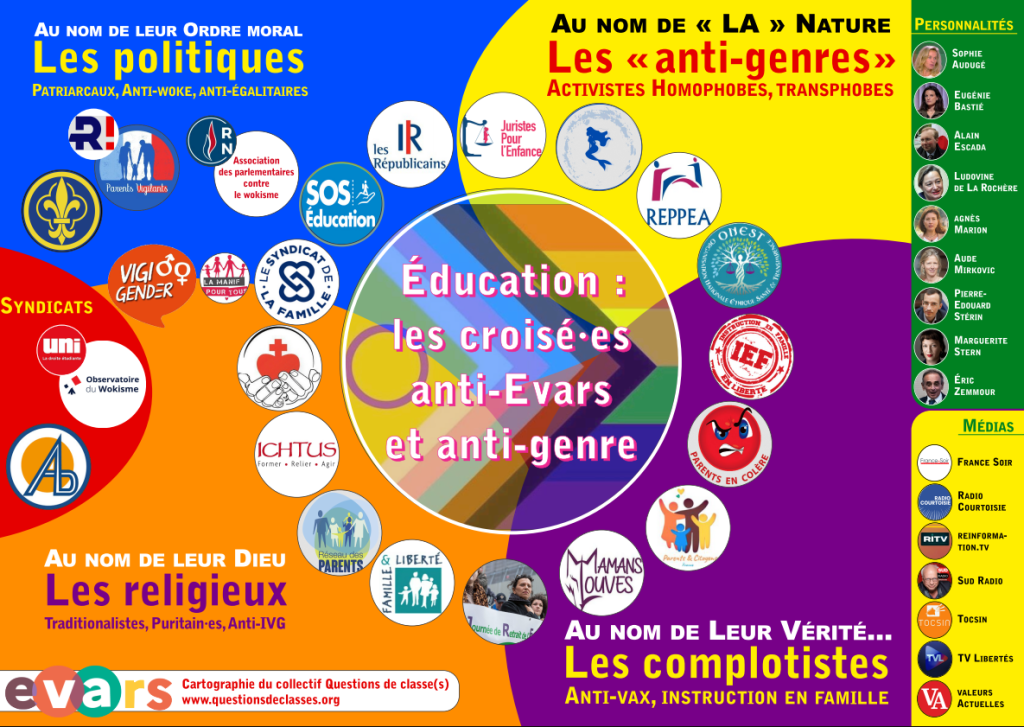Cartographie du collectif Questions de classe(s), « Éducation : les croisé·es anti-Evars et anti-genre », questionsdeclasses.org août 2025 (merci à la personne qui m’a fait connaître cette illustration, au soir du 30 sept. : ça valait bien un but de l’OM contre l’Ajax d’Amsterdam [match ayant lieu en même temps, dont je n’ai pu par conséquent suivre que la fin, en bénéficiant toutefois d’un résumé précis et enthousiaste à mon arrivée ; étant quant à lui au Vélodrome, Quentin Ballue – avec Léna Bernard –, « On voulait voir, on a vu et Paixão n’a pas déçu », sofoot.com 1er oct.] ; v. infra la note 34, en reliant la digression qui précède à la note 37 in fine