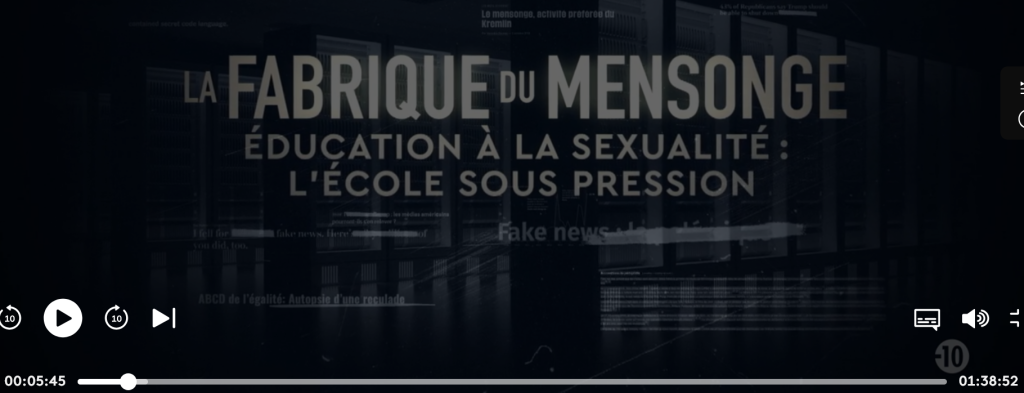 Capture d’écran ajoutée le 2 octobre : « La fabrique du mensonge. S5 – Education à la sexualité, l’école sous pression », france.tv 2025 (lien actif jusqu’au 13/11 ; v. aussi rtbf.be 8 mai), entre deux extraits d’Éric Fassin, quelques minutes avant d’entendre Élise Devieilhe (v. respectivement les notes 1 et 37) et Caroline Désir (wikipedia.org au 24 sept. : ministre [belge] de l’Éducation de la Fédération Wallonie-Bruxelles « dans le gouvernement Jeholet », de 2019 à 2024)