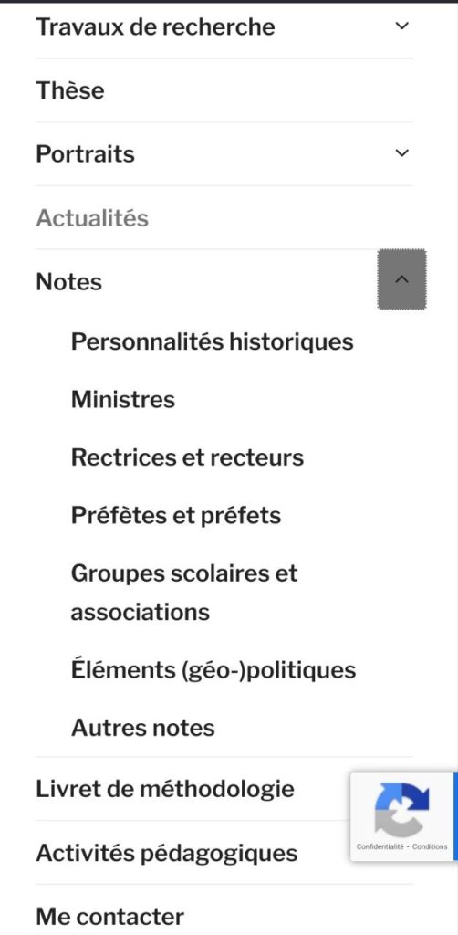 En cas d’écran partagé et, surtout, depuis un téléphone – ou une tablette, je suppose –, c’est à partir du menu de ce site qu’il est possible de descendre jusqu’à ces Notes, la flèche à droite permettant de sélectionner l’une des rubriques (v. ci-contre).