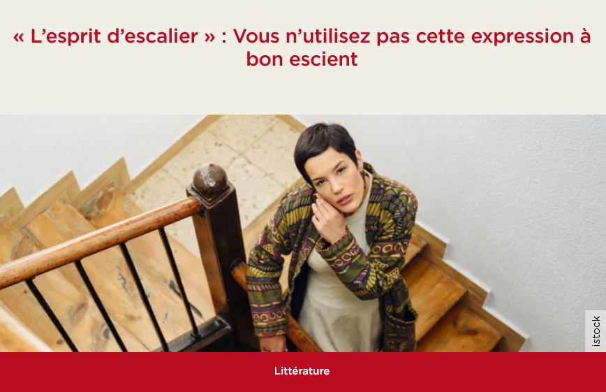 « Les expressions françaises décortiquées (explications sur l’origine, signification, exemples, traductions) ; tel est le sous-titre d’un site que je consulte assez régulièrement depuis plus d’une décennie (au moins), expressio.fr/ : avoir l’esprit de l’escalier constitue l’une d’entre elles, qui me sert parfois pour me justifier de revenir sur une conversation, en essayant de le faire à bon escient (v. ci-contre).