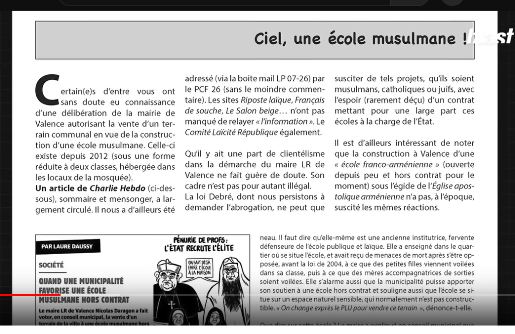 | ↑53 | Courrier du maire de Valence à l’Observatoire de la laïcité, 25 juill. 2022, p. 2 ; page suivante encore, il faisait notamment remarquer que la vente envisagée ne l’était pas à vil prix, puis concluait à nouveau très clairement : « Dans ces conditions, un refus de la proposition d’achat qui nous a été faite aurait pu être qualifié d’abus de pouvoir et de discrimination » ; v. Thibaut Carage, « La vente du terrain annulée pour l’école musulmane : « Il y a une discrimination évidente » selon l’association », ledauphine.com 4 oct. 2022 (vidéo de Mourad Jabri, aux micros d’Europe 1 et France Bleu ; mis à jour le 6 oct. 2023). L’opération n’était pas dénuée d’un intérêt électoral – comparable à celui expliquant le soutien initial des « républicains » du Nord au lycée Averroès –, dans l’espoir de s’attirer les suffrages des citoyen·nes valentinois·es de confession musulmane. D’aucuns croient aujourd’hui déceler un clientélisme similaire dans le soutien – pourtant somme toute assez mesuré – apporté par les forces de gauche aux structures confessionnelles aujourd’hui lâchées par les autorités publiques, alors qu’il est possible au contraire d’y voir une réaction laïque : la laïcité bien comprise, c’est l’égalité des droits, sans condition religieuse. Dans le même sens et dès la rentrée, Jean Debraine écrivait dans son article – qui apparaît à l’écran dans le reportage de Blast en avril 2024 (v. l’illustration ajoutée au début de mon billet du 31 mai) – titré « Ciel, une école musulmane », Le Mécréant ardécho-drômois sept. 2022, n° 170 – Bulletin de la FADLP, p. 16, spéc. 17 : « vendre un terrain équivaut ici à « favoriser » » ; ayant rappelé à la page précédente que la Libre Pensée persiste – quant à elle – « à demander l’abrogation » de la loi Debré, il poursuivait pages suivantes : « Quelques réalités semblent perdues de vue par les néo-laïques (de droite ou pire) et les ex-laïques qui jadis furent de gauche. 1) En 2021-2021, l’enseignement catholique [rassemblait] 7 297 établissements (site Église catholique en France) [percevant] au moins 12 milliards d’euros annuels. Dans la Drôme, on dénombre 40 écoles et 19 ensembles secondaires. En Ardèche, ce sont 79 écoles et 32 ensembles secondaires qui sont, comme dirait le néo-Charlie, FAVORISÉS. 2) L’exemple de l’école « franco-arménienne » de Valence (200 élèves prévus à terme) est éclairant (…). Force est de constater que l’application des lois antilaïques suscite une indignation sélective… 3) Les arguments tournant autour de la « mixité sociale » dans le quartier de Fontbarlettes, évoqués par l’élue EELV [v. Nathalie De Keyzer, francebleu.fr 25-27 juill. 2022, citant « Annie Roche, l’élue Europe écologie les Verts », se justifiant d’avoir voté contre la délibération avec Bruno Casari, le « conseiller municipal ex LREM » qui contactera immédiatement Charlie Hebdo] et l’observateur de la laïcité 26-07 (dans un courrier au maire de Valence), paraissent quelque peu spécieux. Si le quartier s’est appauvri, ghettoïsé diront certains, c’est à la suite de politiques tant nationales que municipales. En quoi le fait d’empêcher l’implantation d’une école musulmane créerait-il… de la « mixité sociale » ? N’est-ce pas prendre le problème à l’envers ? Et qu’en est-il de la fameuse mixité dans les établissements catholiques de nos deux départements ? » (pp. 17 -18 ; en majuscules, gras et souligné dans le texte). |