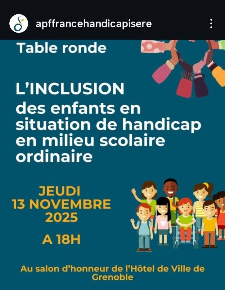En ce fin d’année, j’ai été invité à participer à une table ronde, jeudi 13 novembre 2025 à la mairie de Grenoble, dans le cadre du Mois de l’accessibilité1Annabel Brot, « Mois de l’accessibilité : Enfance et handicap : un défi collectif », grenoble.fr 3 nov. 2025 (calameo.com 24 p., spéc. 8). ; elle était organisée par la délégation iséroise d’APF France handicap2Citant l’une de ses actions pour 2026, v. la troisième note de ce texte, s’arrêtant notamment sur l’opposition de sa délégation drômoise à un projet d’« escalier monumental » à Valence. et avait pour titre : « L’inclusion des enfants en situation de handicap en milieu scolaire ordinaire ».